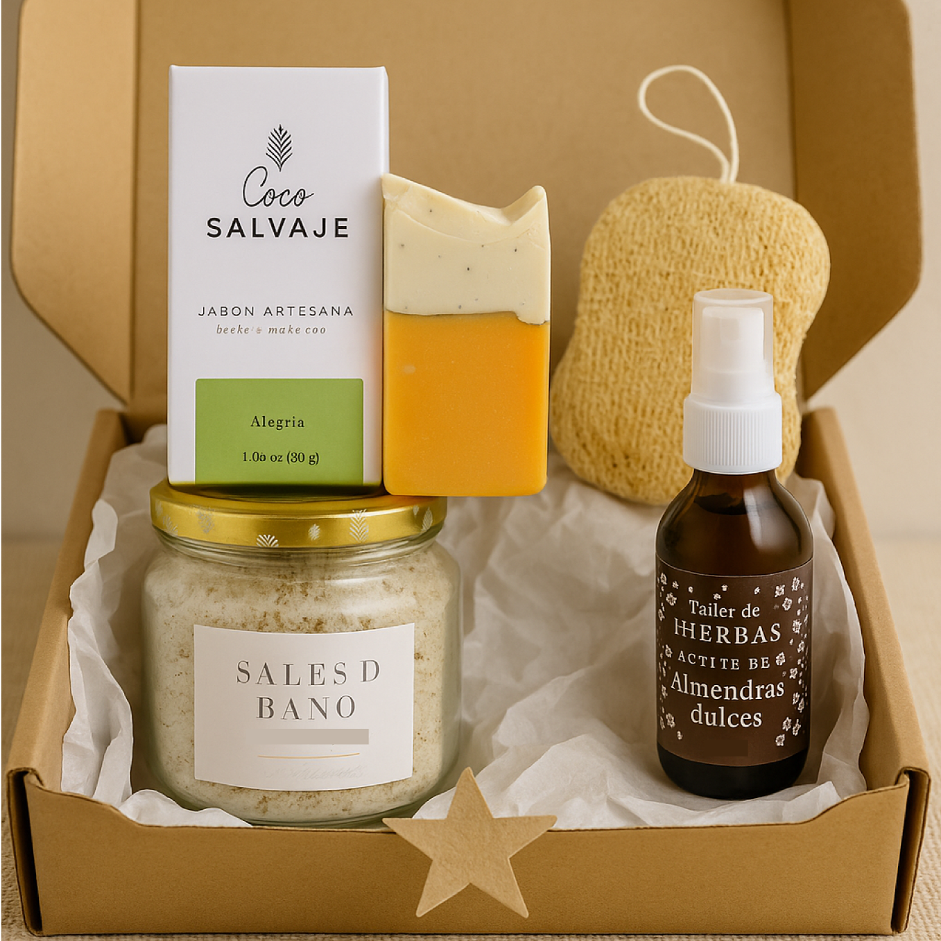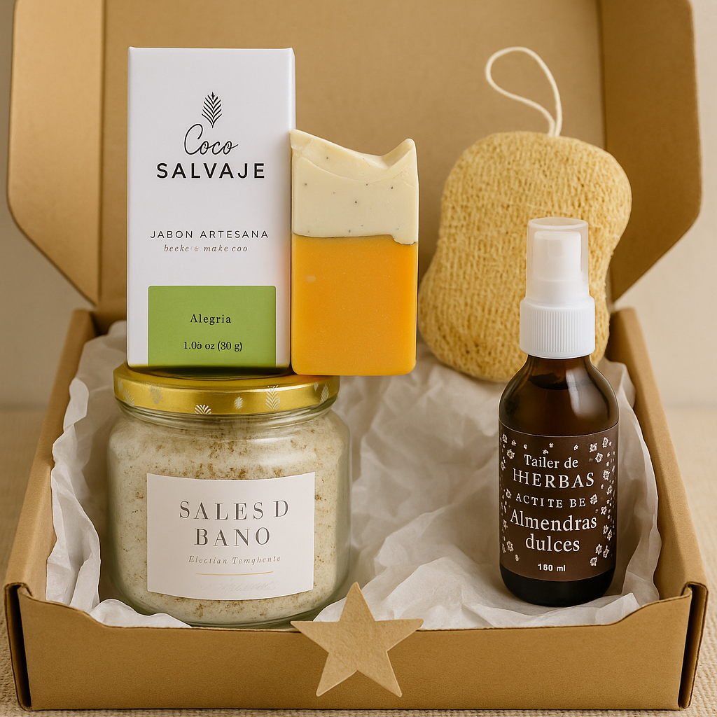Si quieres regalar un kit con el que siempre te recuerden, este es para ti. Este kit incluye un aceite de almendras de 20 ml, un jabón artesanal de 30 gr, sales de baño y una esponja corporal.